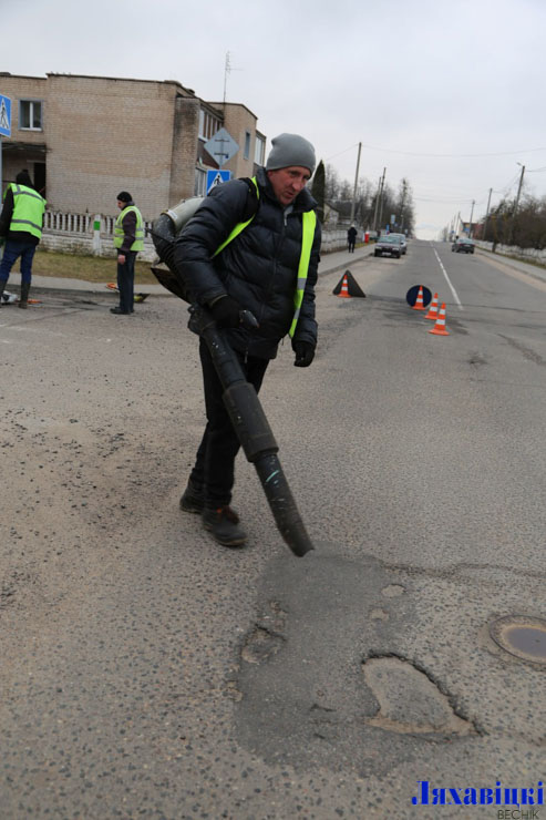 ФОТОФАКТ. Ляховичский коммунхоз проводит ямочный ремонт на улице Десюкевича в райцентре