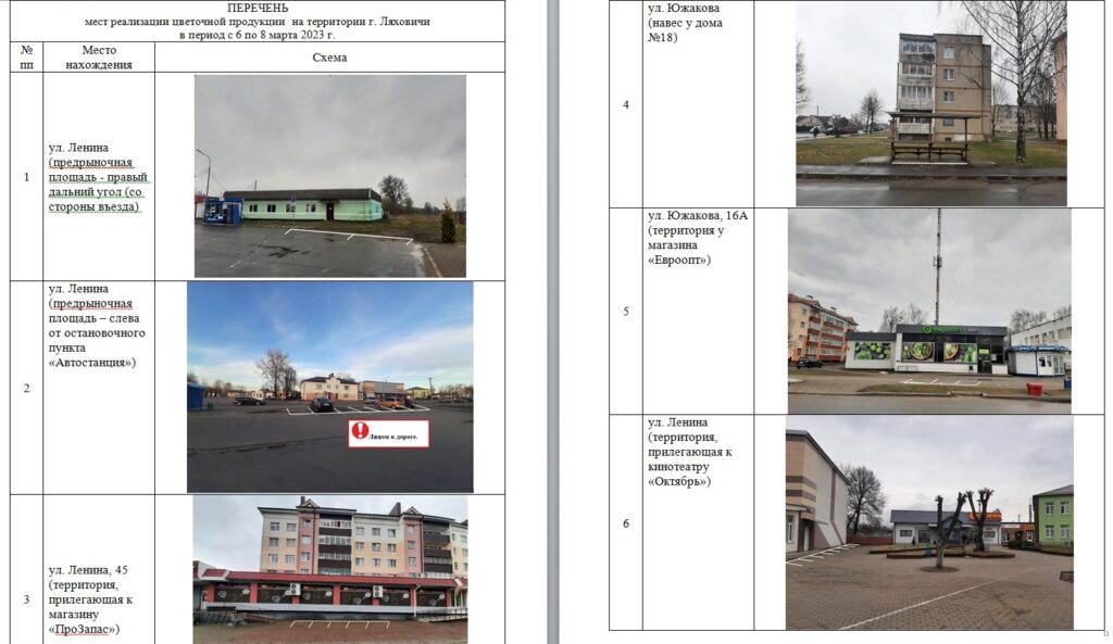 ПЕРЕЧЕНЬ мест реализации цветочной продукции на территории г. Ляховичи в период с 6 по 8 марта 2023 г.