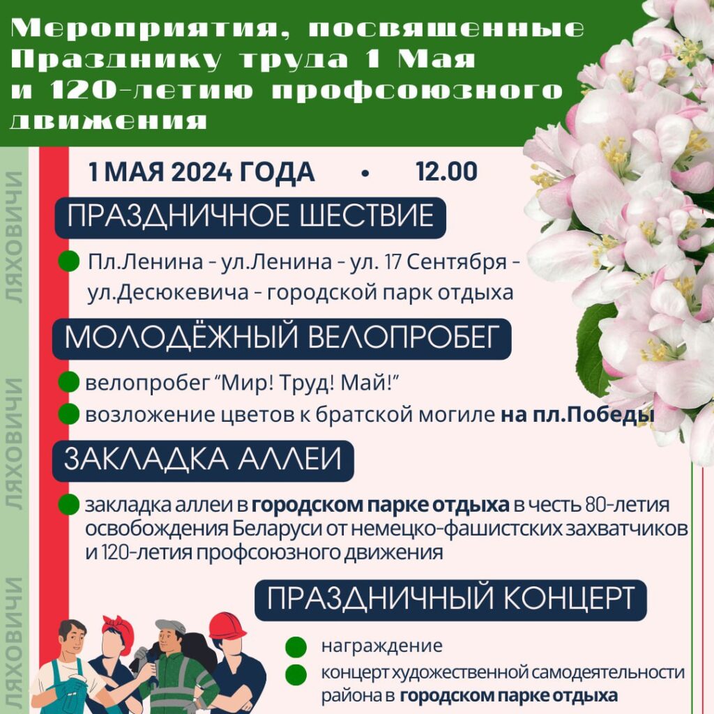Навіны Ляховичи: программа мероприятий к 1 мая и 120-летию профсоюзного движения 22/04/2024 332 redakcyja