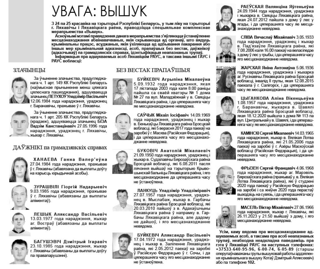 Інфармацыя пра адшукваемых Ляхавіцкім РАУС асоб — у нумары «Ляхавіцкага весніка».