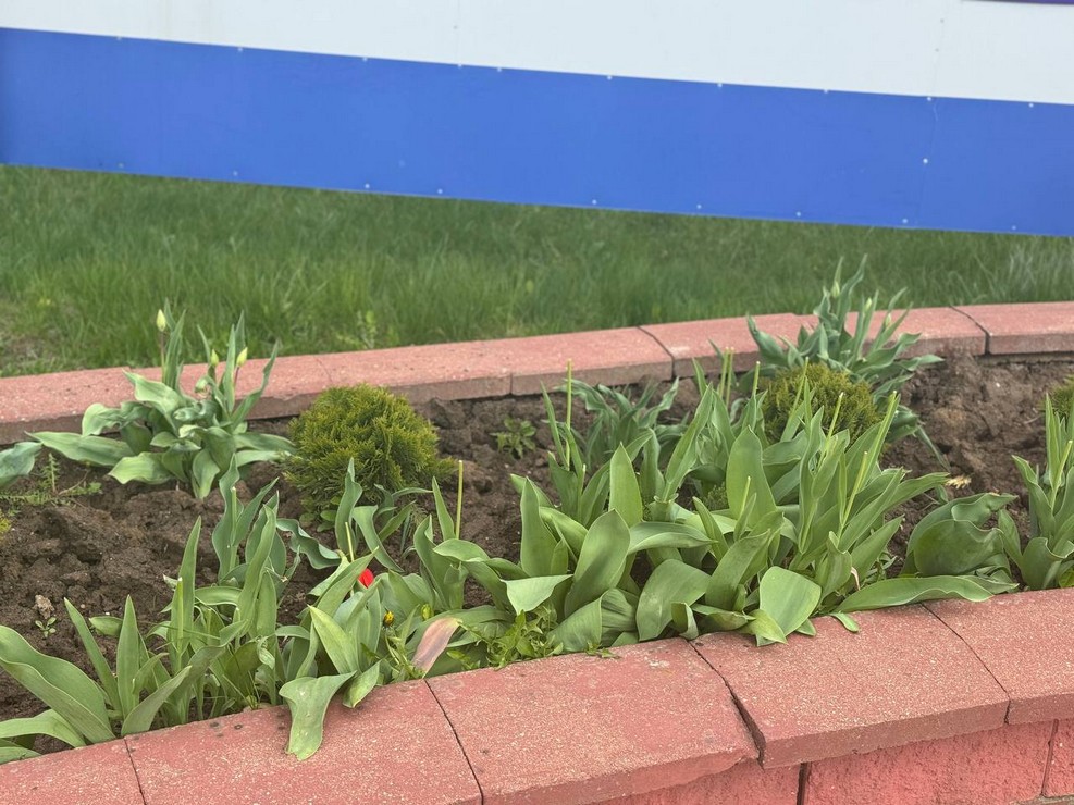 Чырвонымі агеньчыкамі зазіхацелі ў райцэнтры цюльпаны. Але не доўга радавалі кветкі ляхавічан – знайшоўся той, хто пазрываў бутоны. На клумбах каля Галерэі славы і будынка пошты ад цюльпанаў засталося толькі сцябло.
