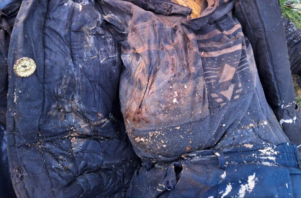 Приметы одежды трупа: куртка темно-синего цвета на пуговицах (роба) с имеющимися по бокам и в области груди карманами, под курткой — телогрейка с подъемным воротником, под телогрейкой — кофта темного цвета с рисунком в виде полос и узоров белого цвета с имеющимся замком под горло, под кофтой – безрукавка вязаная белого цвета, под безрукавкой – гольф темного цвета. Штаны темно-синего цвета с карманами (роба), на которых в области колен имеются следы о ранее размещенных светоотражающих элементов (отсутствуют). Под робой – штаны темного цвета. Обувь – берцы черного цвета, подошва берц имеет следы изношенности (отсутствует часть подошвы в области каблука), на подошве имеется маркировка в виде букв «МБ» ниже имеется буква «И», сбоку цифры «270». Также при трупе обнаружены спецовки темно-синего цвета.