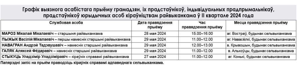 Навіны Графік выязнога асабістага прыёму кіраўніцтвам райвыканкама ў II квартале 2024 года 24/05/2024 94 redakcyja
