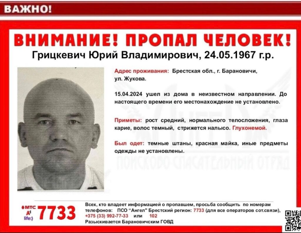 Барановичским ГОВД разыскивается Грицкевич Юрий Владимирович, 1967 г.р., который ушёл из дома в г. Барановичи в неизвестном направлении, и его местонахождение не установлено