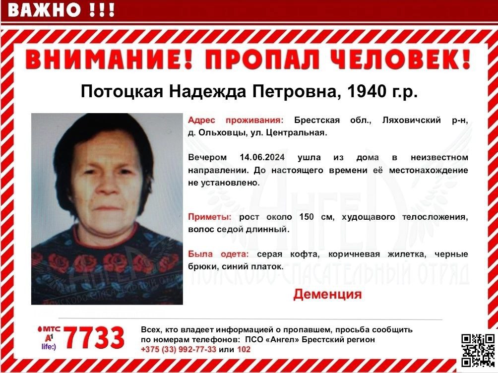 Пропавшая жительница д. Ольховцы Надежда Потоцкая найдена.