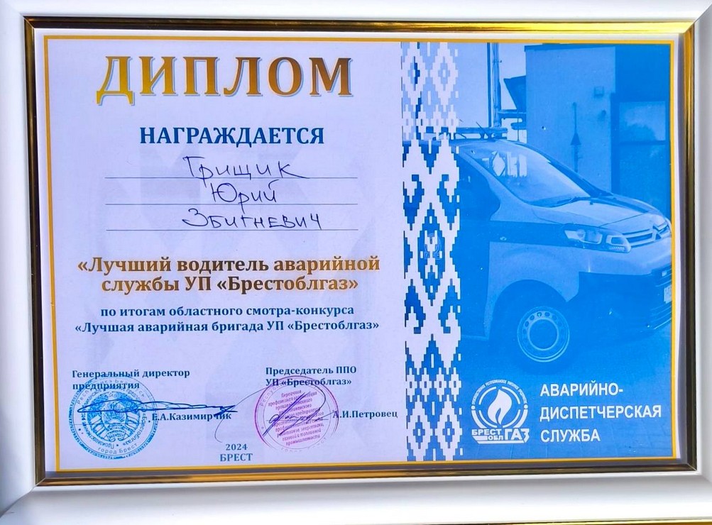 По итогам областного смотр-конкурса бригада аварийно-диспетчерской службы ПУ «Барановичигаз» Ляховичского района газоснабжения заняла 4 место, а водитель Грищик Юрий Збигневич награжден дипломом «Лучший водитель аварийно-диспетчерской службы УП «Брестоблгаз».