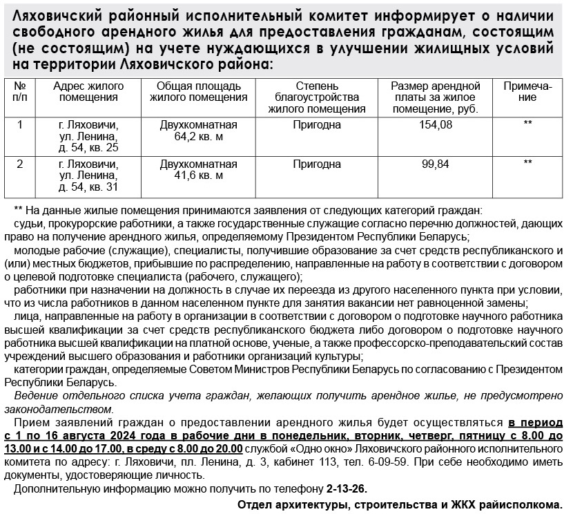 Навіны Ляховичский районный исполнительный комитет информирует о наличии свободного арендного жилья для предоставления гражданам, состоящим (не состоящим) на учете нуждающихся в улучшении жилищных условий 31/07/2024 164 redakcyja