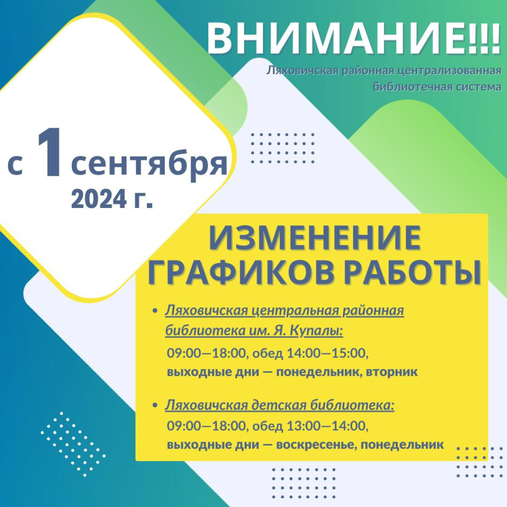 Уважаемые жители г.Ляховичи и Ляховичского района! С 1 сентября 2024 г. изменились режимы работы некоторых библиотек. Ознакомьтесь с изменениями!