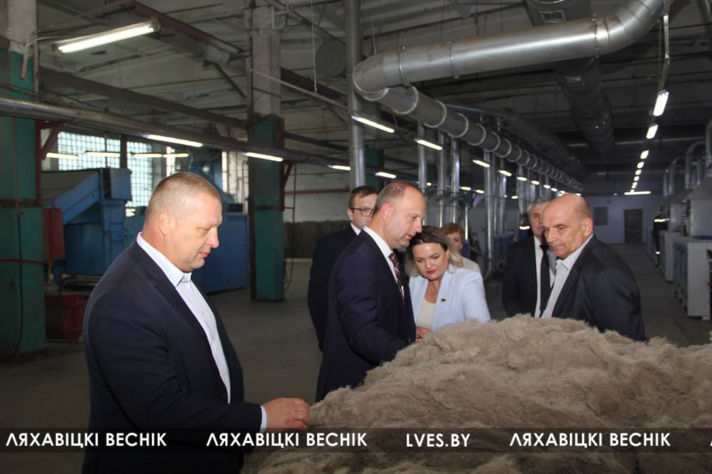 Міністр эканомікі Юрый Чабатар разам са старшынёй камітэта эканомікі Брэсцкага аблвыканкама Наталляй Аляхновіч, старшынёй Ляхавіцкага райвыканкама Мікалаем Марозам пабывалі ў новым ільнозаводскім цэху, дзе наладжаны выпуск інавацыйнага віду прадукцыі, пазнаёміліся з працэсам вытворчасці.
