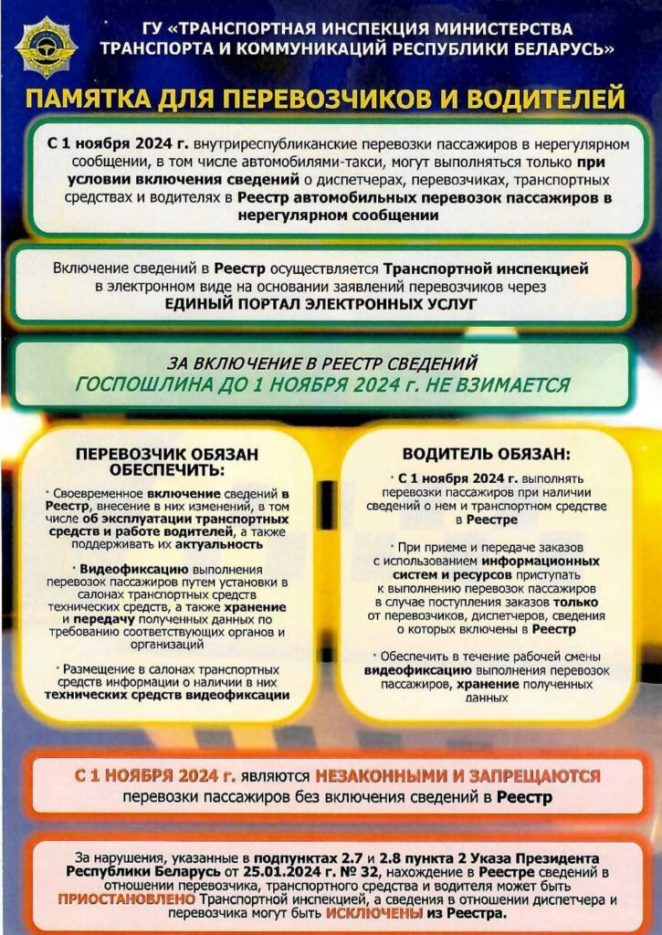 Министерство транспорта и коммуникаций (далее – Минтранс) сообщает, что Указом Президента Республики Беларусь от 25 января 2024 г. № 32 «Об автомобильных перевозках пассажиров» (далее – Указ) предусмотрено создание государственного информационного ресурса «Реестр автомобильных перевозок пассажиров в нерегулярном сообщении» (далее – реестр).