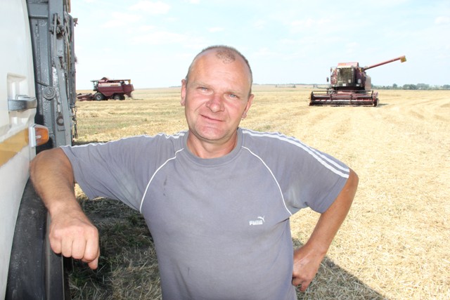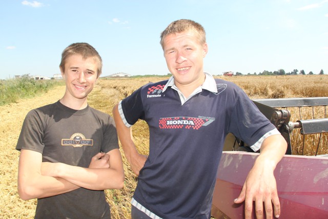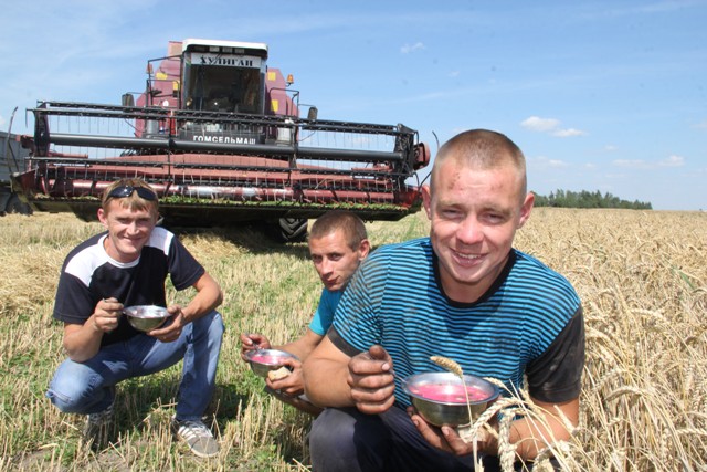 Хіба толькі тое, што надвор’е ўсё ж такі пакінула свой адбітак на пшанічных палетках. Прычым, у літаральным сэнсе: у выглядзе суцэльнай палёгліцы асобных участкаў. Адсюль і хлебаробская задача нумар адзін: завяршыць уборку “пацярпелых” участкаў да дажджоў. У адваротным выпадку не пазбегнуць зернестрат: вільгаць справакуе хуткі рост і прарастанне праз збажыну пустазелля, што, канешне ж, значна пагоршыць якасць камбайнавання. Усе асноўныя ўборачныя сілы іменна тут: 10 камбайнаў, МАЗы на адвозцы зерня – толькі з прычэпамі. Ну і абед – мы засталі якраз той час – толькі каб паабедаць, папоўніць запасы вады. І — за штурвал камбайна.