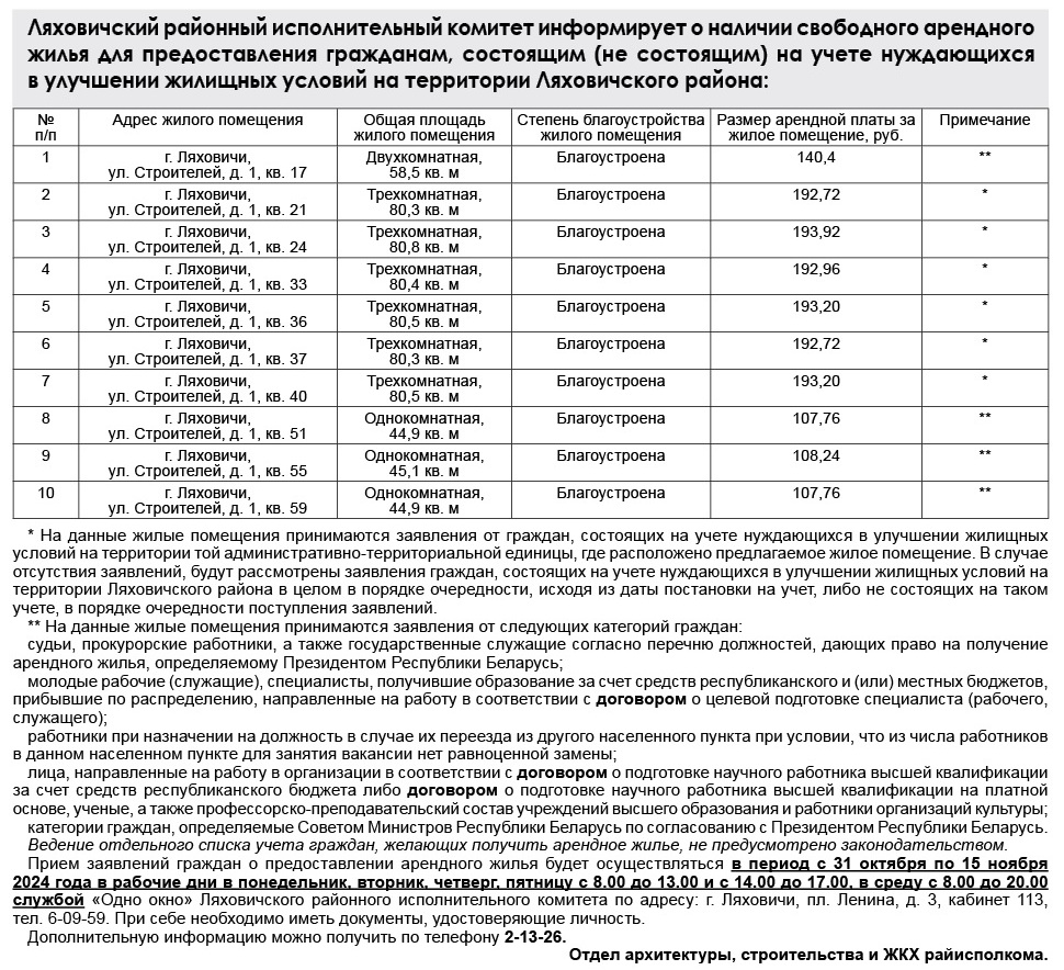 Навіны Ляховичский районный исполнительный комитет информирует о наличии свободного арендного жилья для предоставления гражданам, состоящим (не состоящим) на учете нуждающихся в улучшении жилищных условий на территории Ляховичского района 30/10/2024 231 redakcyja