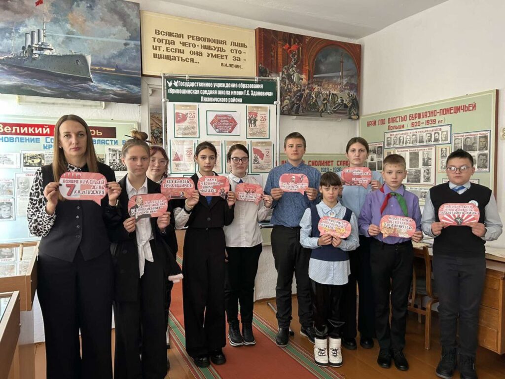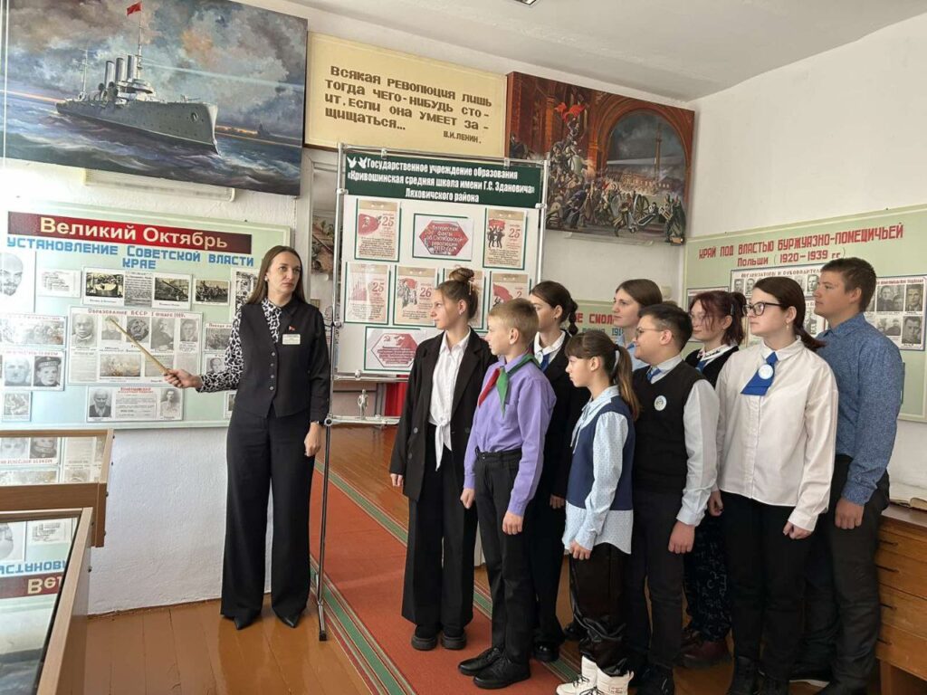 Напярэдадні Дня Кастрычніцкай рэвалюцыі ў гісторыка-краязнаўчым музеі Крывошынскай СШ імя Г. С. Здановіча адбыўся ўрок-экскурсія. Школьнікам расказалі пра важнасць гістарычнай падзеі, з якой мінула 107 гадоў. Сёмы дзень лістапада па праве лічыцца адным з сімвалаў барацьбы за сацыяльную справядлівасць і мір ва ўсім свеце. Бясплатныя адукацыя і медыцынскае абслугоўванне, васьмігадзінны рабочы дзень, ліквідацыя саслоўных прывілеяў, роўнасць грамадзянскіх правоў жанчын і мужчын і многае іншае стала заваяваннем таго часу.