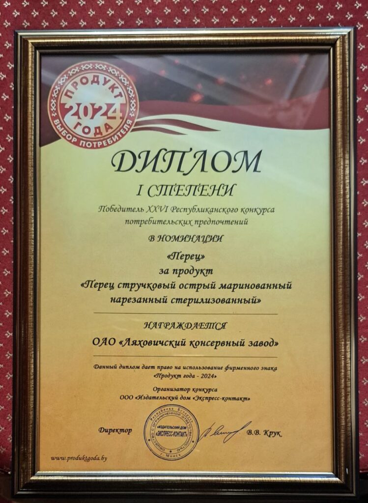Диплом 1 степени в номинации «маринады» — у продукции завода «Перец стручковый острый маринованный нарезанный стерилизованный»