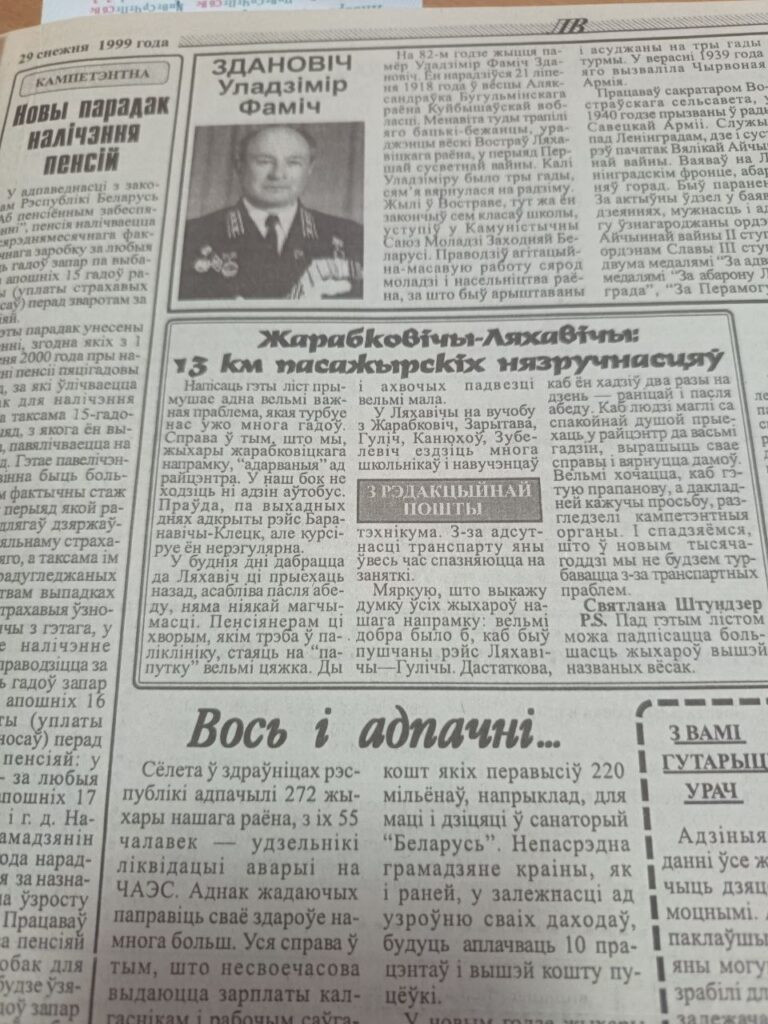 У раённай газеце «Ляхавіцкі веснік» за 29 снежня 1999 года было змешчана пісьмо жыхаркі вёскі Жарабковічы з просьбай дапамагчы ў тым, каб для жыхароў «жарабковіцкага напрамку» адкрылі рэйсы аўтобуса. «У наш бок