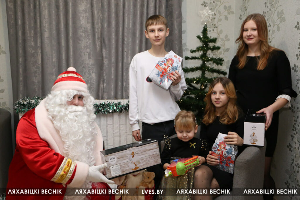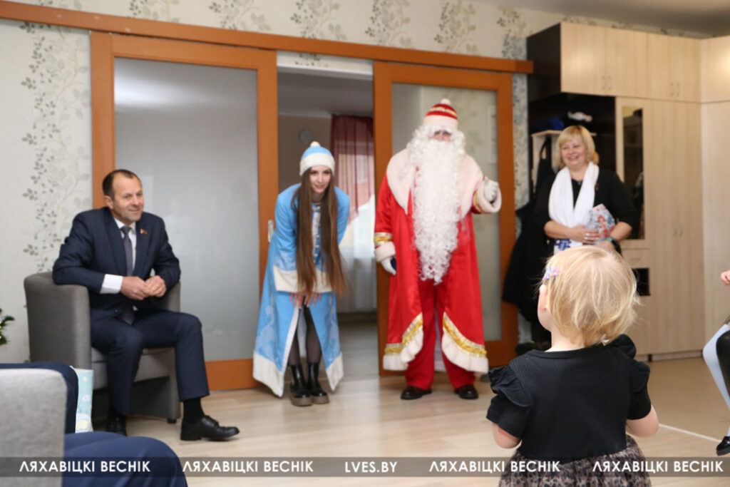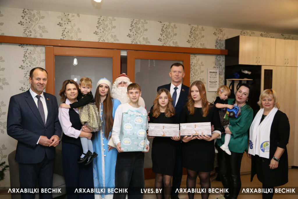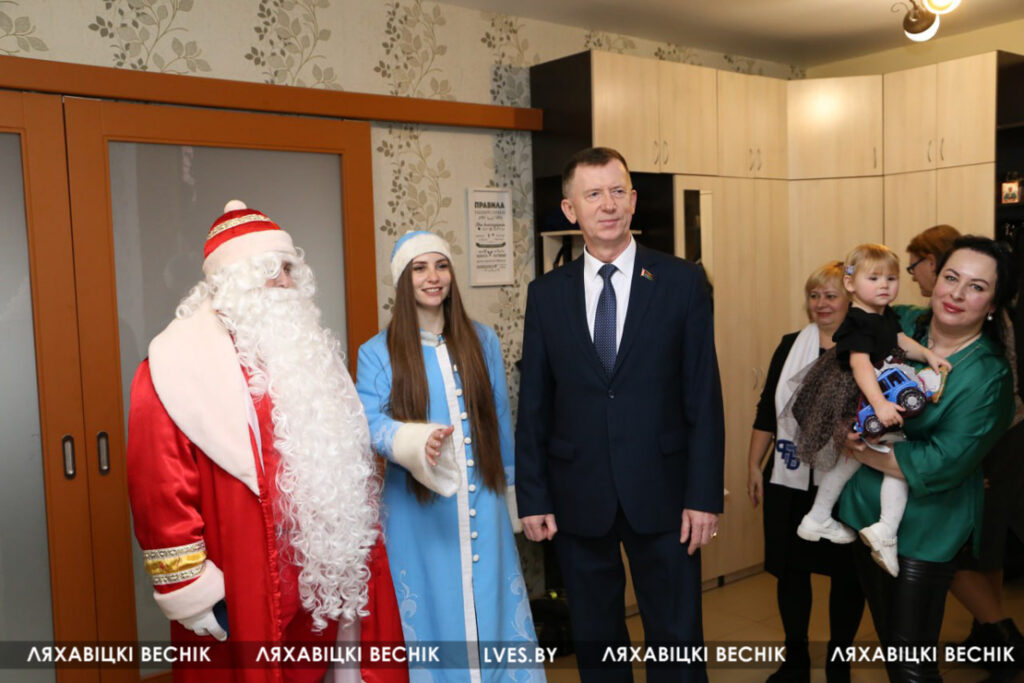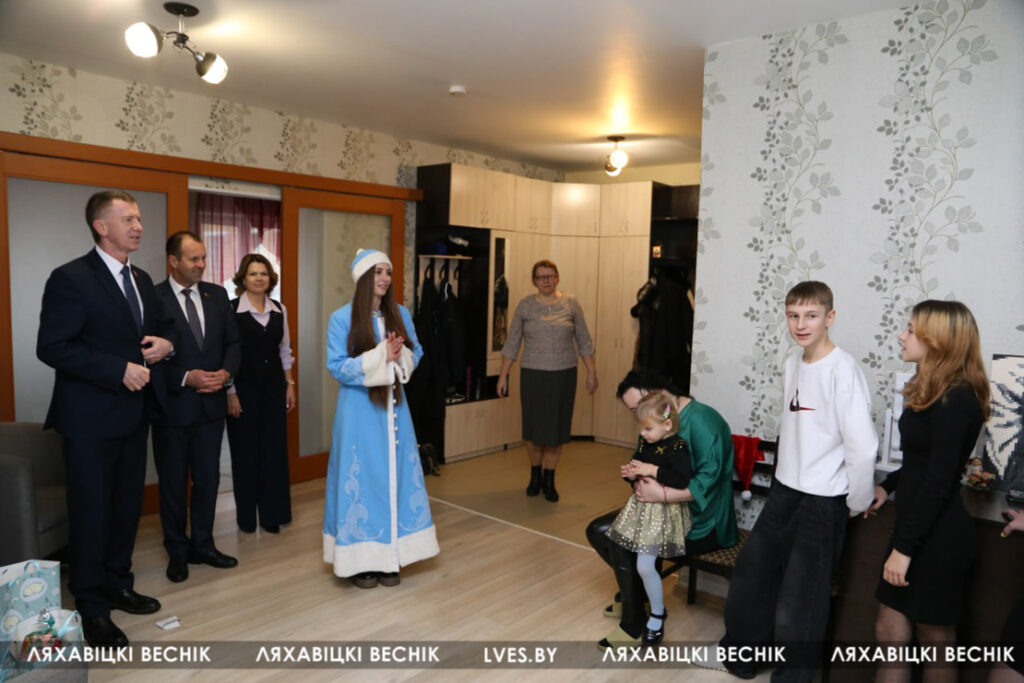 Семью ляховичан Смирновых. которые буквально днями переселились в детский дом семейного типа на улице Чкалова, сегодня пришли поздравить Дед Мороз и Снегурочка, а также депутат Палаты представителей Национального собрания Республики Беларусь Георгий Хлебович, председатель Ляховичского районного Совета депутатов Юрий Черенкевич, начальник отдела по образованию Мария Сороковик.