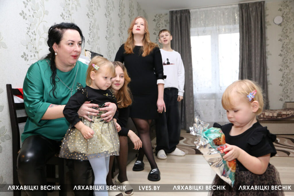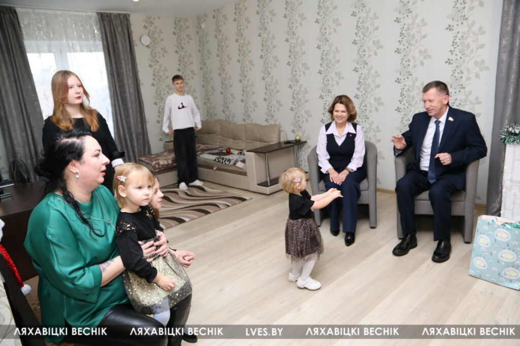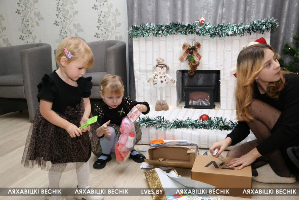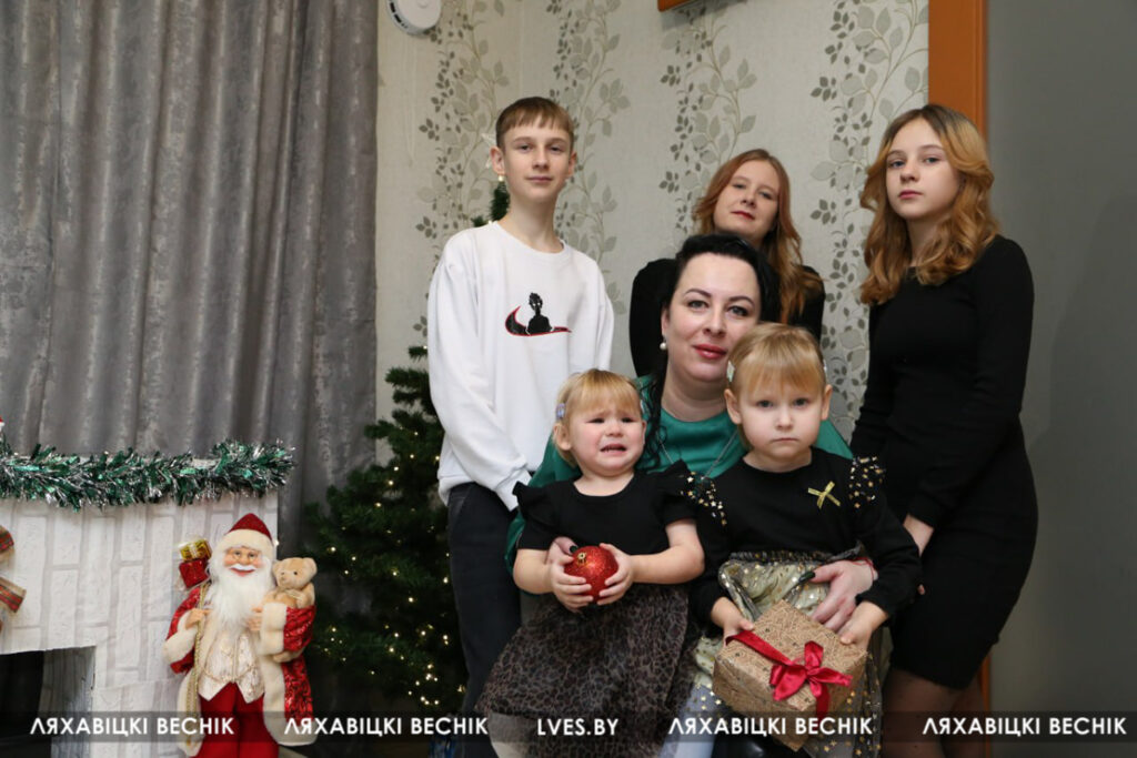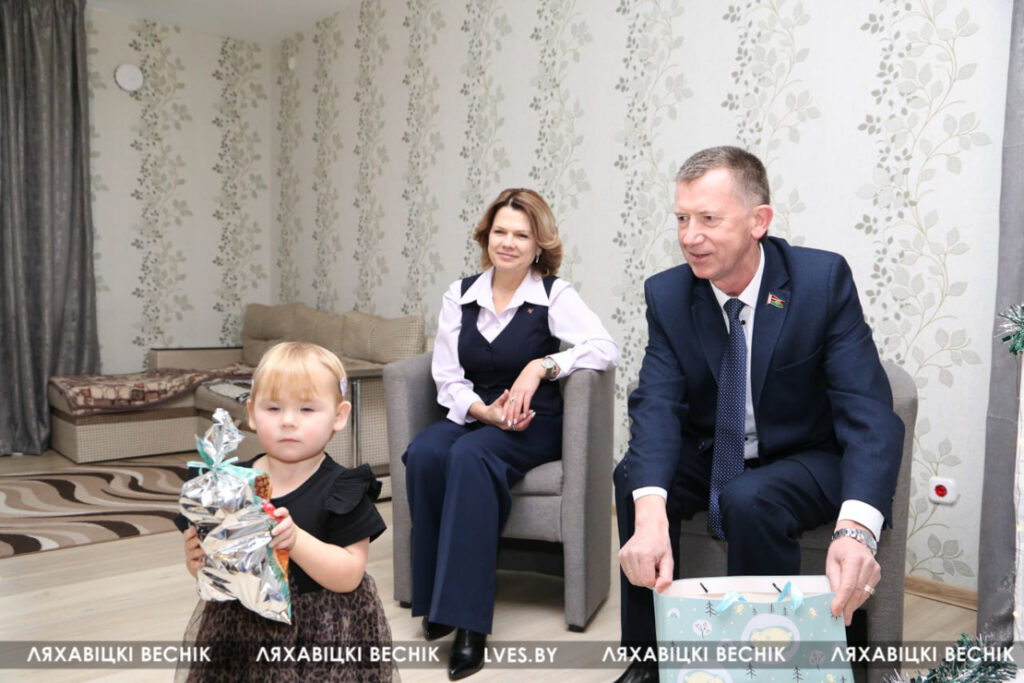 Семью ляховичан Смирновых. которые буквально днями переселились в детский дом семейного типа на улице Чкалова, сегодня пришли поздравить Дед Мороз и Снегурочка, а также депутат Палаты представителей Национального собрания Республики Беларусь Георгий Хлебович, председатель Ляховичского районного Совета депутатов Юрий Черенкевич, начальник отдела по образованию Мария Сороковик.