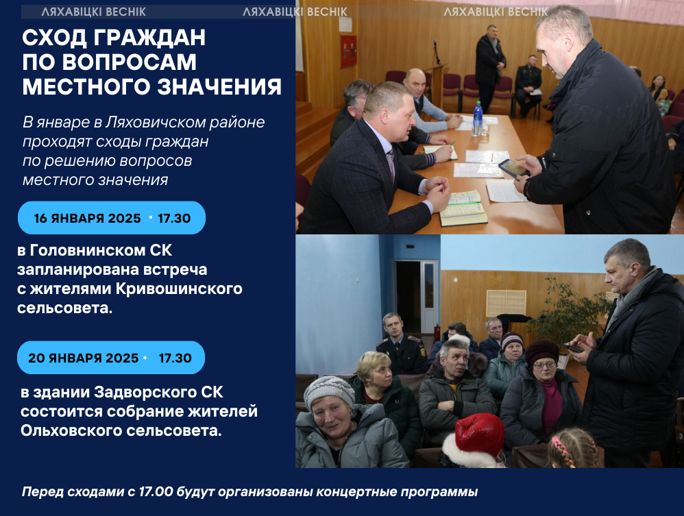 Навіны Сходы граждан по вопросам местного значения проходят в Ляховичском районе 13/01/2025 77 redakcyja