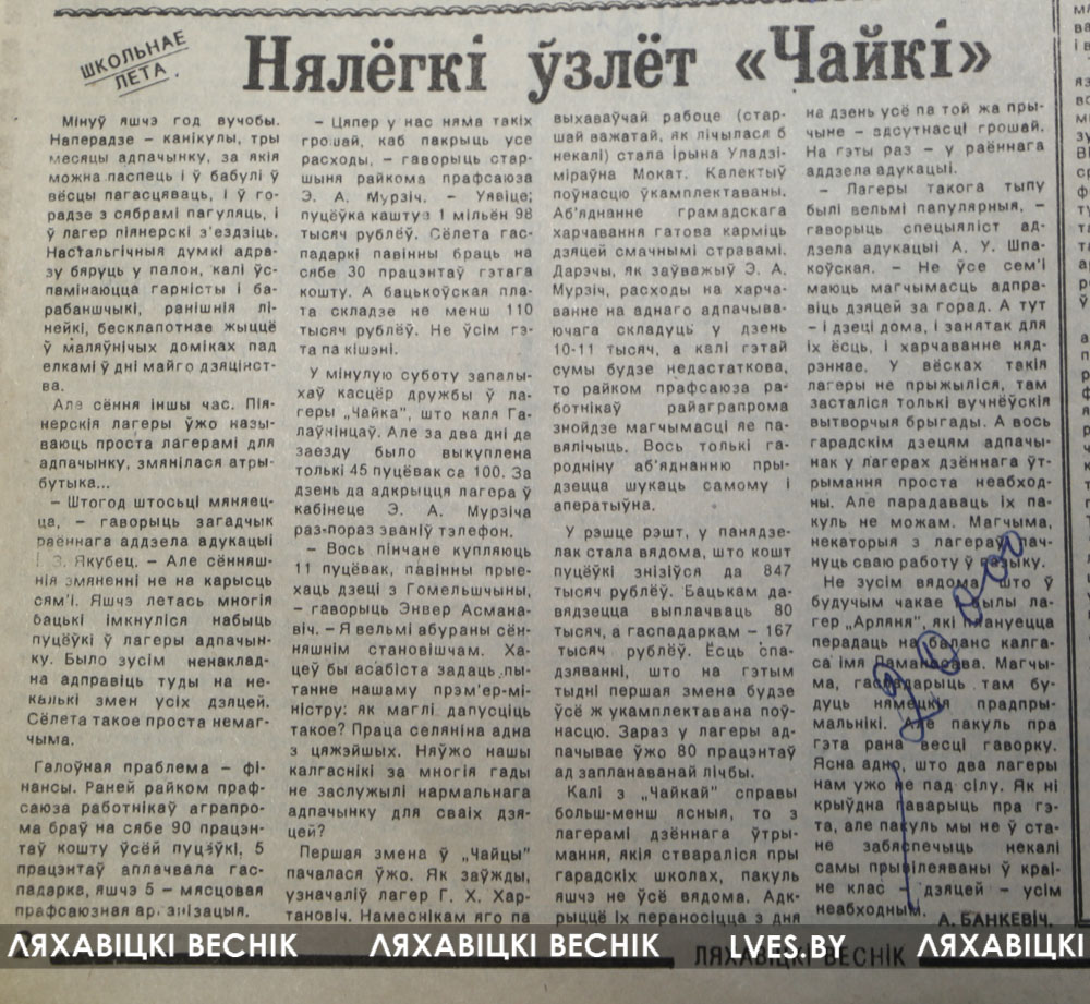 У «Ляхавіцкім весніку» за 10 чэрвеня 1994 года ў артыкуле «Нялёгкі ўзлёт «Чайкі» надрукавана: «За два дні да заезду было выкуплена толькі 45 пуцёвак са 100…». А гэта ўжо свежыя даныя: па інфармацыі цэнтра забеспячэння дзейнасці бюджэтных арганізацый за чэрвень –
