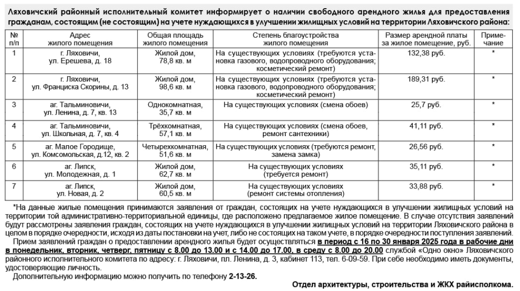 Навіны Ляховичский районный исполнительный комитет информирует о наличии свободного арендного жилья для предоставления гражданам, состоящим (не состоящим) на учете нуждающихся в улучшении жилищных условий на территории Ляховичского района 15/01/2025 65 redakcyja