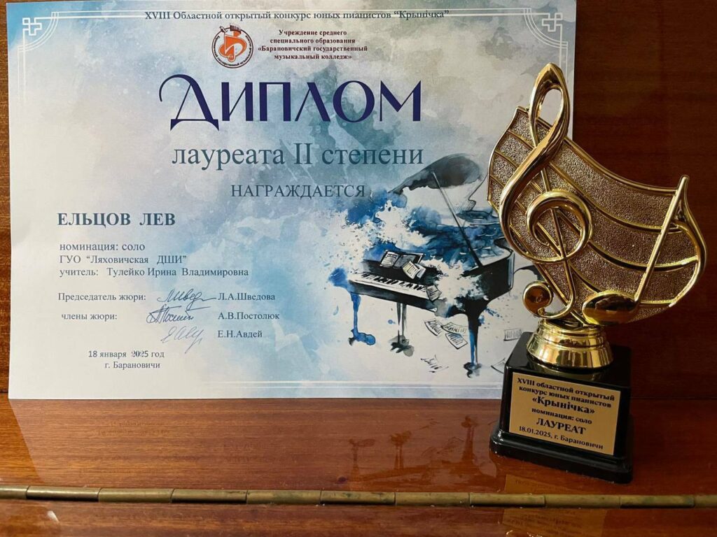18 января 2025 года успешно выступил в ХVIII областном открытом конкурсе юных пианистов «Крынiчка» ученик 4 класса ГУО «Ляховичская детская школа искусств» Лев Ельцов (учитель Ирина Тулейко ).