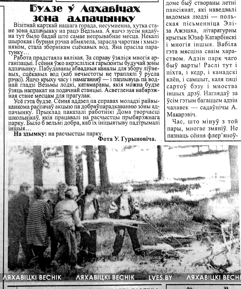 Напрыканцы мінулага стагоддзя раённай уладай было прынята рашэнне ўладкаваць на беразе Ведзьмы гарадскую зону адпачынку. Ляхавічане ўзяліся за работу зноў жа талакой. Раёнка ўважліва сачыла за пераўтварэннямі на зоне адпачынку. Так, у № 50 за 30.06.1999 у артыкуле «Будзе ў Ляхавічах зона адпачынку» размова ішла