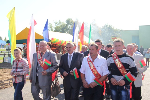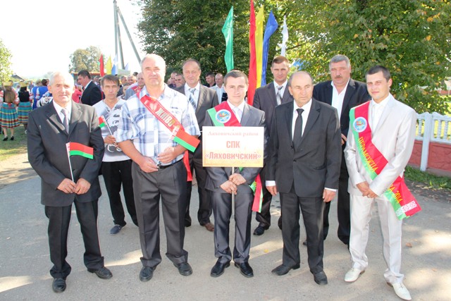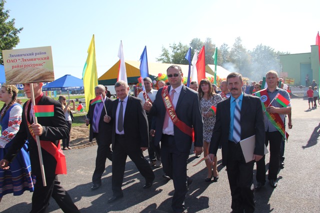 Вось яно, урачыстае шэсце галоўных герояў, рупліўцаў зямлі ляхавіцкай! Як і належыць, у першых радах героі-перадавікі, кіраўнікі сельгаспрадпрыемстваў. Святочная калона прайшла перад гасцямі фестывалю, якія шчыра віталі лепшых хлебаробаў. Кульмінацыя свята разварочвалася на сцэне СДК.