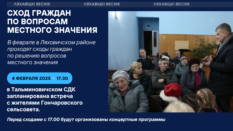 Грамадства Навіны Сход граждан по вопросам местного значения пройдёт 4 февраля в Тальминовичах для жителей Гончаровского сельсовета 28/01/2025 325 redakcyja