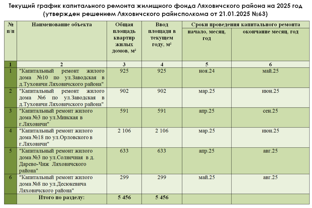 Годовой план текущего ремонта жилищного фонда г. Ляховичи и Ляховичского района 2025 год
