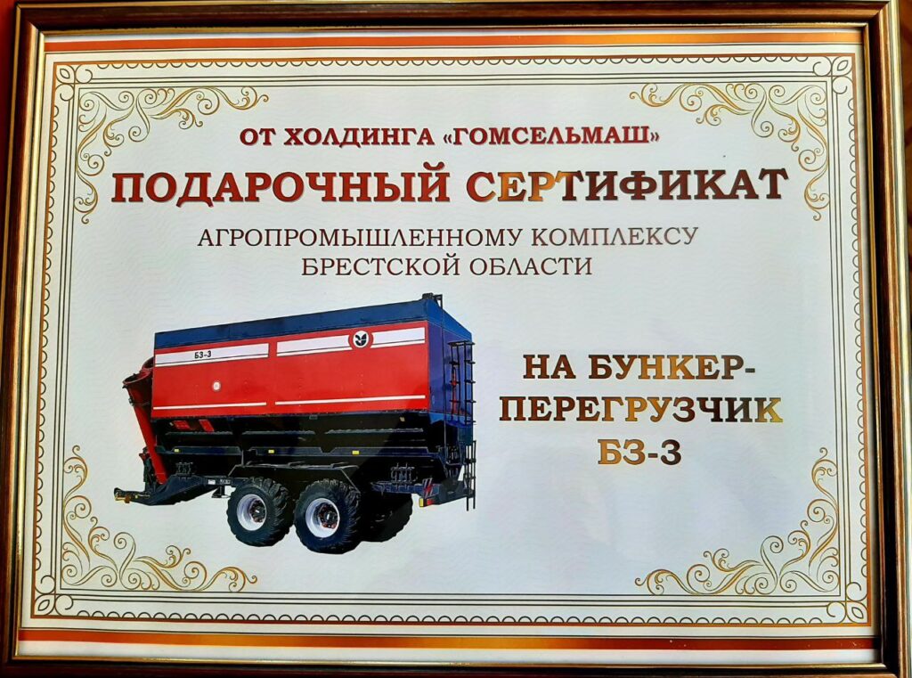 В феврале по подарочному сертификату от Холдинга «Гомсльмаш» прямо с конвеера ОАО «ГЗЛиН» получен бункер-перегрузчик (накопитель) БЗ-3 стоимостью 106115 рублей.