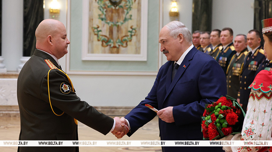 Президент Беларуси Александр Лукашенко вручил государственные награды и генеральские погоны представителям высшего офицерского состава. Торжественная церемония состоялась 20 февраля во Дворце Независимости, передает корреспондент БЕЛТА.