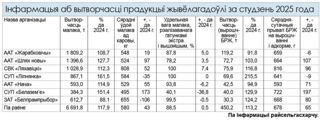 каровы павялічылася на больш як 170 кілаграмаў і мала чаго не дасягнула пяці цэнтнераў за месяц. Пры тым, што названая арганізацыя застаецца адзінай у раёне, дзе сярэдняя месячная прадукцыйнасць каровы не дабірае да паўтоны малака. Пры тым, што ёсць, напрыклад, «Ляхавіцкі», які да сваіх і без таго высокіх мінулагодніх паказчыкаў удойнасці за студзень прыбавіў яшчэ паўцэнтнера – да больш як 800 кілаграмаў.