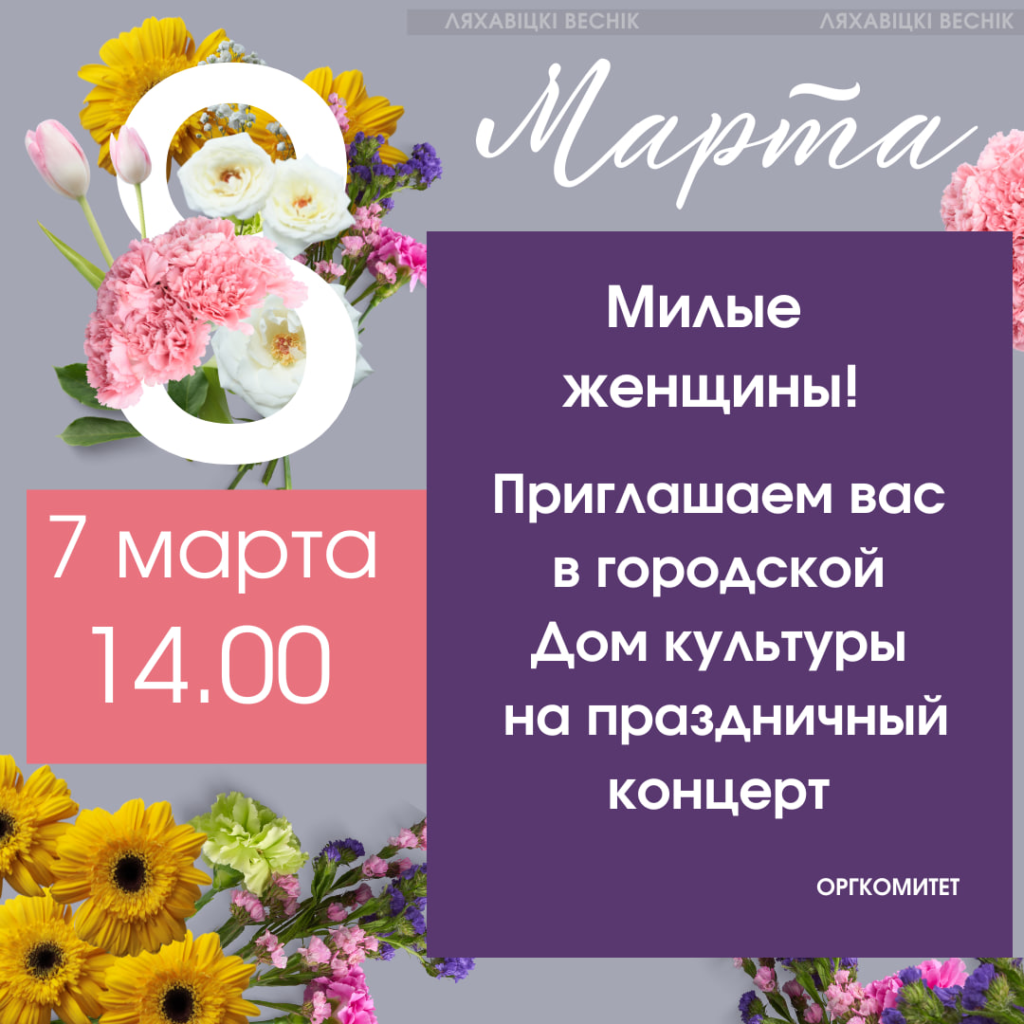 Важное Навіны 7 марта в Ляховичах пройдет праздничный концерт, посвященный Дню женщин 04/03/2025 389 redakcyja