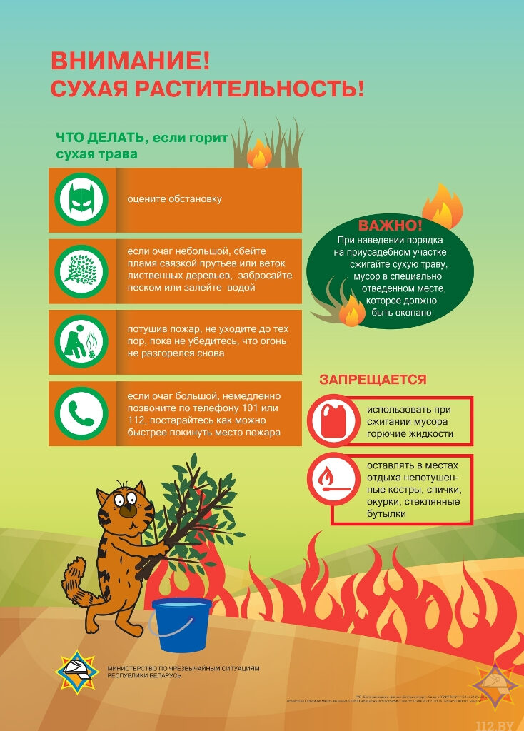 В пожароопасный период не используйте открытый огонь в лесах и на торфяниках, не бросайте окурки, спички, осколки стекла. Это может привести к трагедии: от полыхающей травы загораются жилые дома, огонь переходит на лесные массивы и может принять угрожающие размеры, переходя в торфяные и лесные пожары. Будьте осторожны!