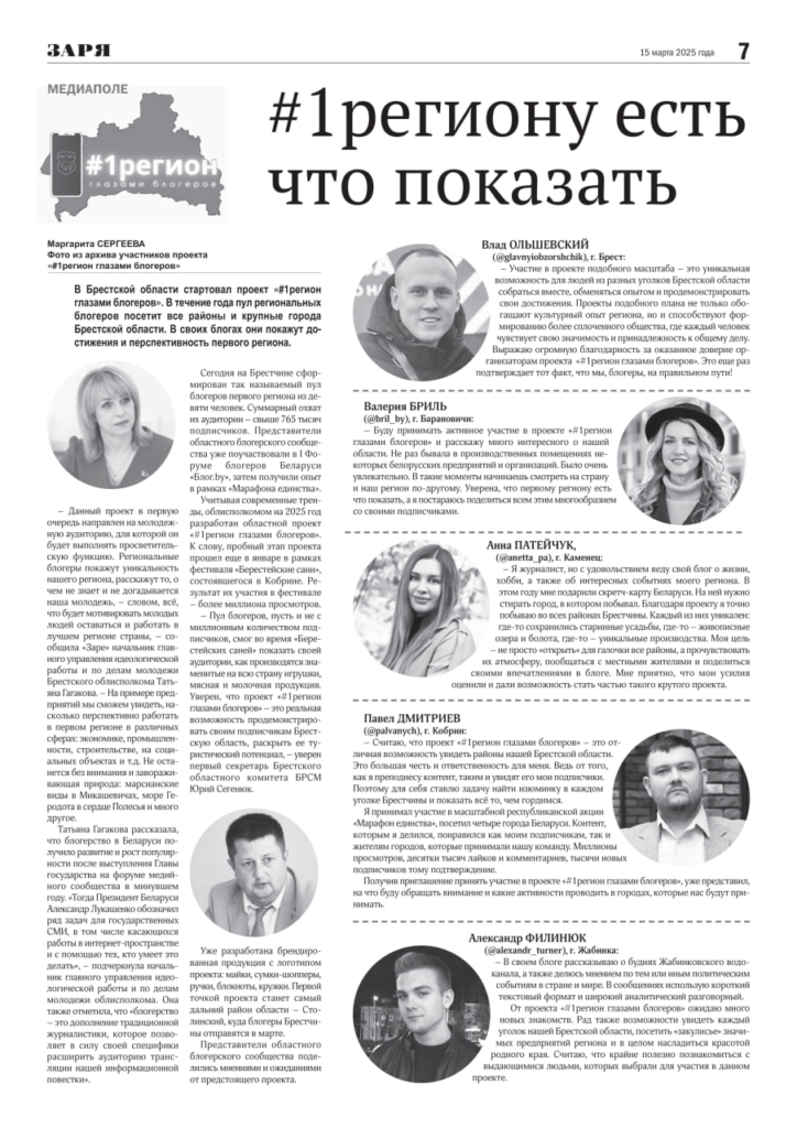 В завтрашнем номере «Зари» (http://t.me/zaryaby) выйдет тематическая полоса о проекте «#1регион глазами блогеров»