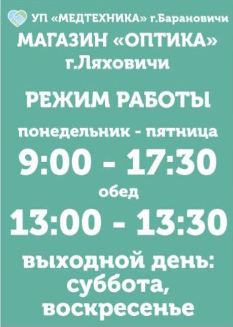 Уважаемые покупатели, открылся новый магазин «Оптика», для удобства клиентов располагается он в здании больницы по адресу г.Ляховичи, пер.Пушкина, 7 ( рядом с магазином Белсоюздрук)