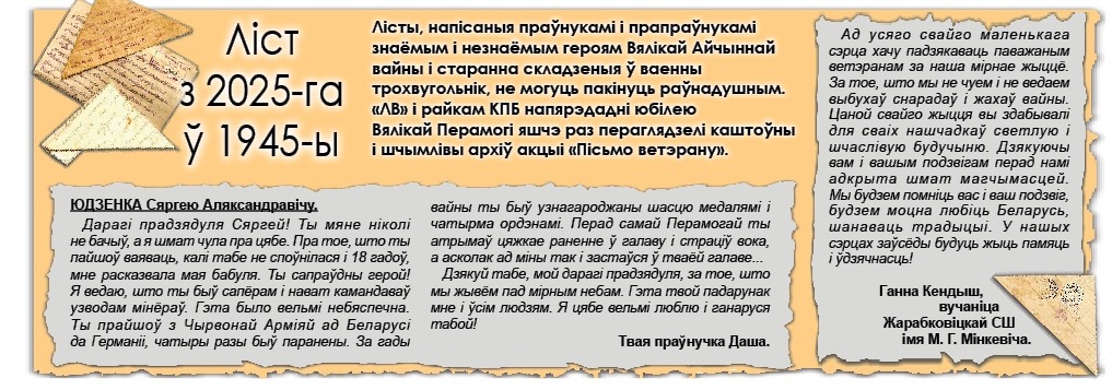 Лісты, напісаныя праўнукамі і прапраўнукамі знаёмым і незнаёмым героям Вялікай Айчыннай вайны і старанна складзеныя ў ваенны трохвугольнік, не могуць пакінуць раўнадушным. «ЛВ» і райкам КПБ напярэдадні юбілею Вялікай Перамогі яшчэ раз пераглядзелі каштоўны і шчымлівы архіў акцыі «Пісьмо ветэрану».