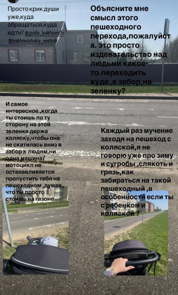 Ляхавічанка даслала фота пешаходнага пераходу па вуліцы Кальцавой у Ляхавічах і пацікавілася, навошта патрэбны такі пераход «у нікуды» – на зялёную зону ў агароджу. Як адзначыла ляхавічанка, нязручнасці асабліва адчуваюцца, калі заходзіш на пешаходны пераход з каляскай…