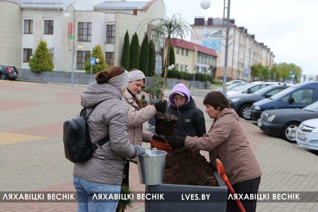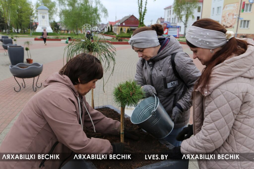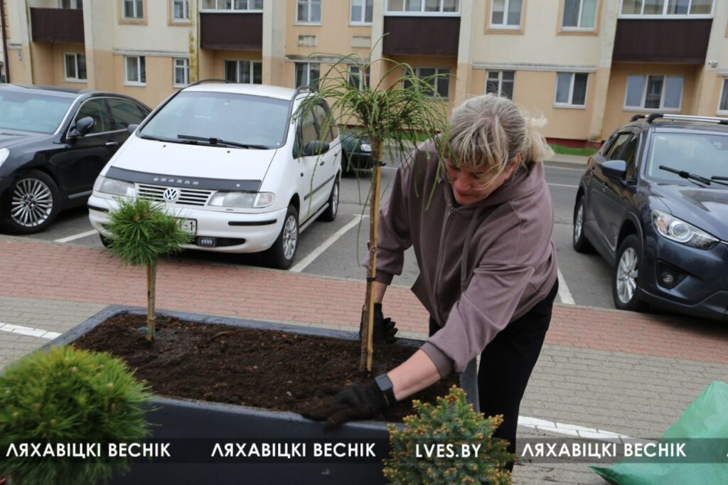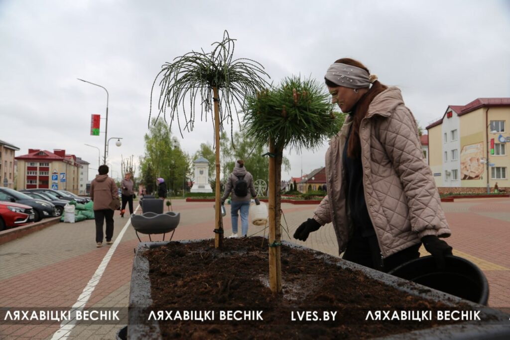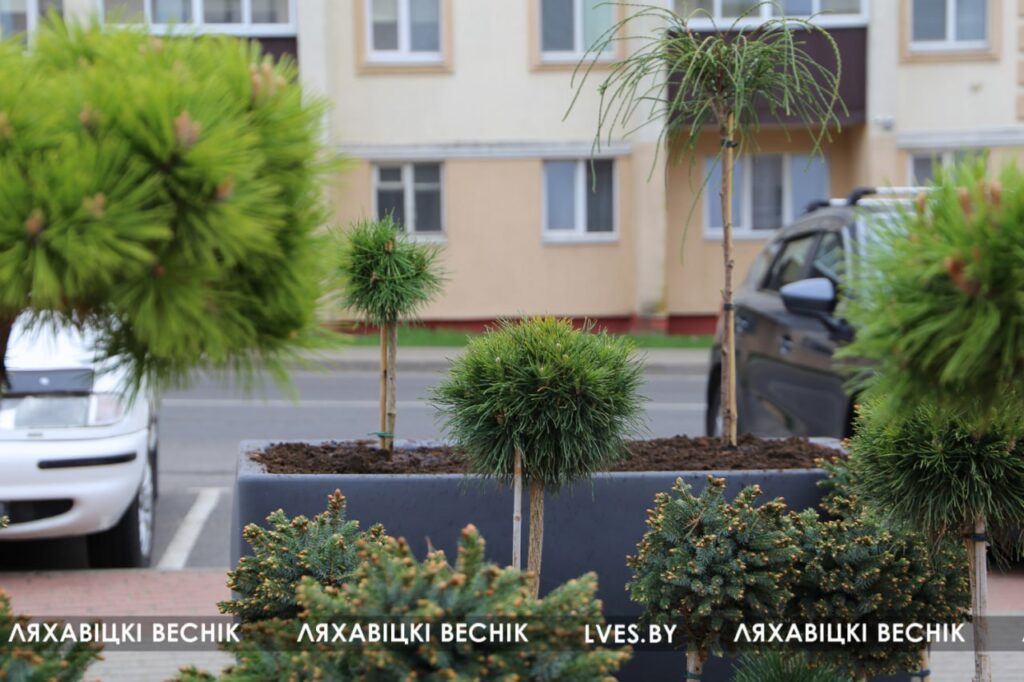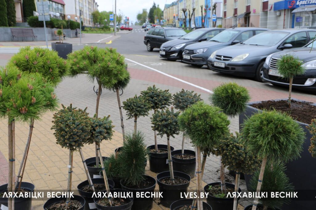 В качестве зелёных насаждений — декоративные хвойные растения, привитые на штамбе.