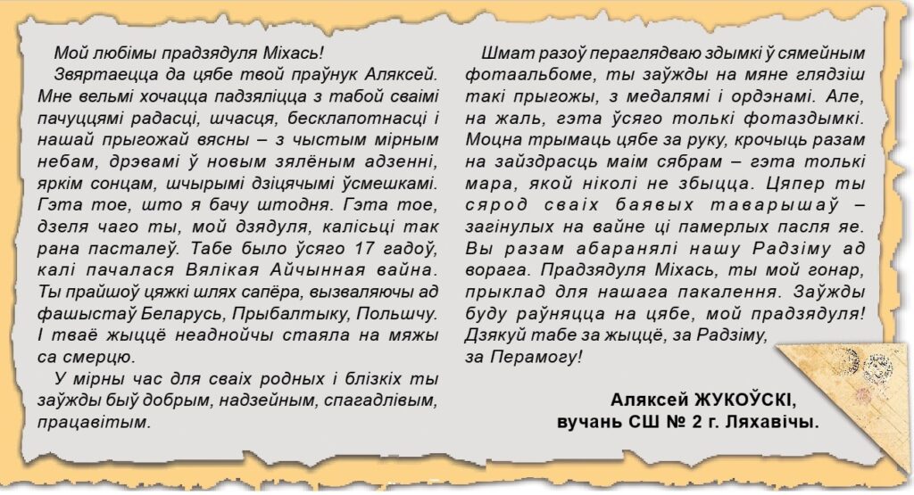 Звяртаецца да цябе твой праўнук Аляксей. Мне вельмі хочацца падзяліцца з табой сваімі пачуццямі радасці, шчасця, бесклапотнасці і нашай прыгожай вясны – з чыстым мірным небам, дрэвамі ў новым зялёным адзенні, яркім сонцам, шчырымі дзіцячымі ўсмешкамі. Гэта тое, што я бачу штодня. Гэта тое, дзеля чаго ты, мой дзядуля, калісьці так рана пасталеў. Табе было ўсяго 17 гадоў, калі пачалася Вялікая Айчынная вайна.