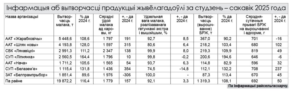 Павышэнне валавой вытворчасці малака адзначана ў шасці з сямі ляхавіцкіх гаспадарак. Нягледзячы на факт падзення мінулагодніх тэмпаў, калі месячны рост валавых надояў адрозніваўся ад базавых паказчыкаў у разы, па выніках сакавіка бягучага года вал вытворчасці малака ў «Ліпнянцы» падняўся больш як на 64 працэнты і застаецца