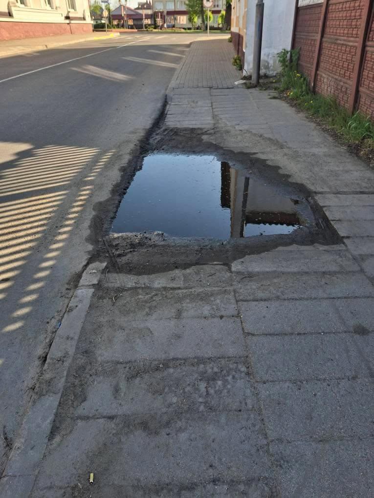 Ляховичанка обратила внимание на проблемное место на тротуаре в начале улицы Комсомольской. Недалеко от магазина “Мебель” на пешеходной дорожке образовалась вмятина, которая после дождя превращается в глубокую лужу.