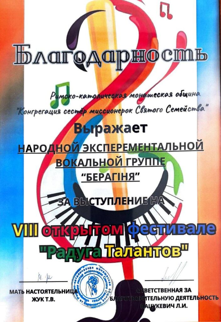 Среди тех, кто создавал душевную атмосферу (https://t.me/art_school_lyahovichi/1260) для участников фестиваля, — народная экспериментальная вокальная группа «Берагiня» Ляховичской детской школы искусств.