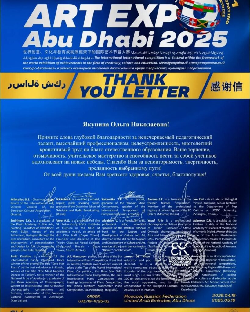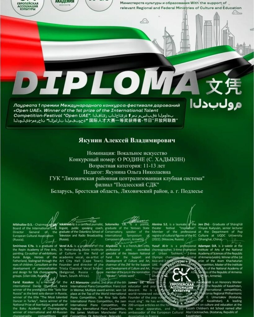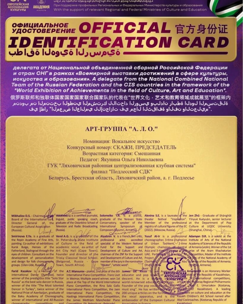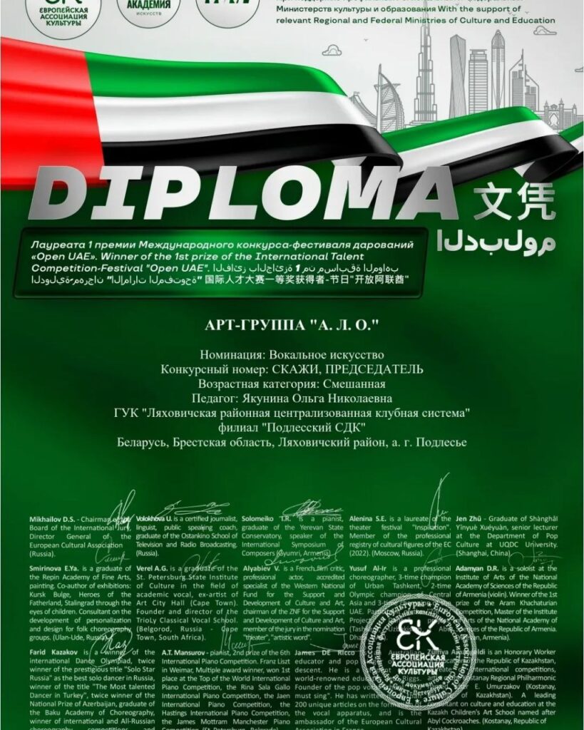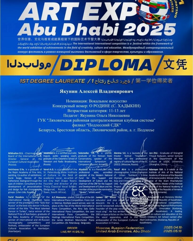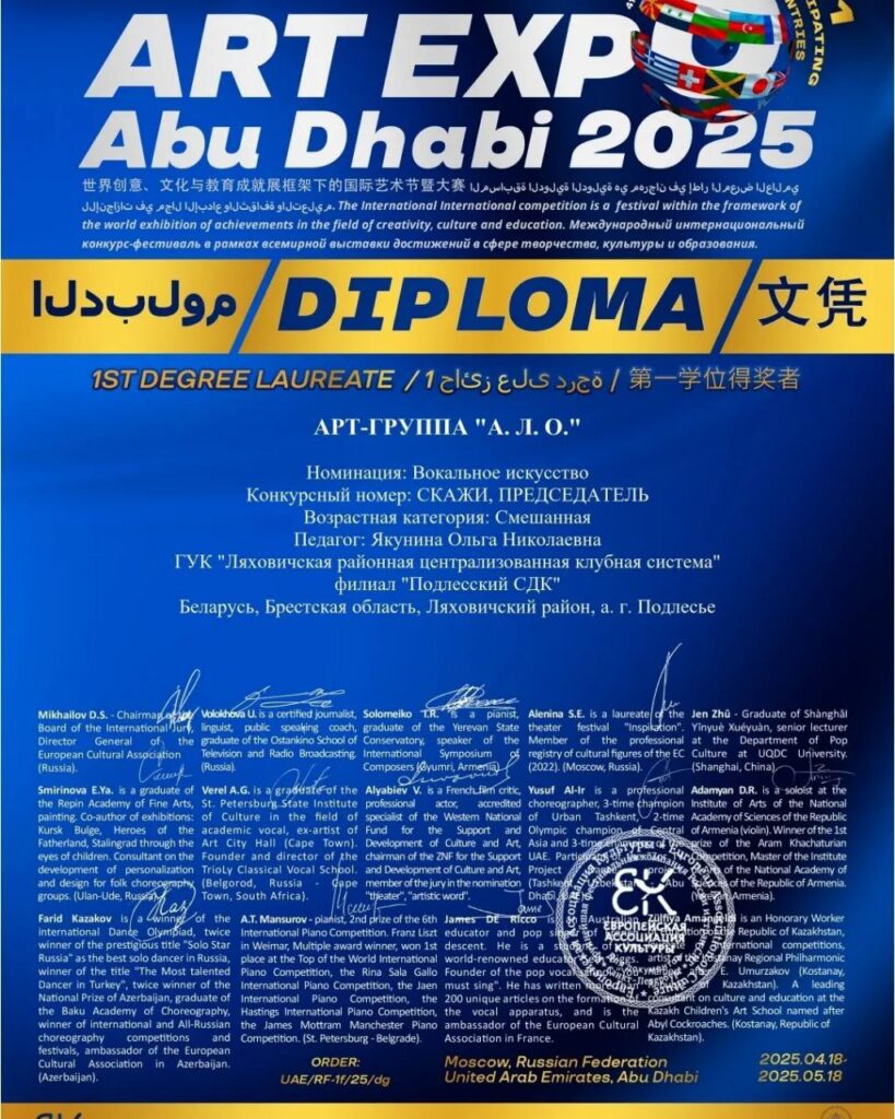 Арт -группа «А. Л. О» и Алексей Якунин — участник художественной самодеятельности филиала «Подлесский СДК» ГУК»Ляховичская районная централизованная клубная система » стали обладателями дипломов Лауреатов 1 степени на международном фестивале-конкурсе ART EXPO ABU DHABI 2025🇦🇪 и стали делегатами от Национальной объединённой сборной РФ и стран СНГ в рамках «Всемирной выставки достижений в сфере культуры,искусства и образования».