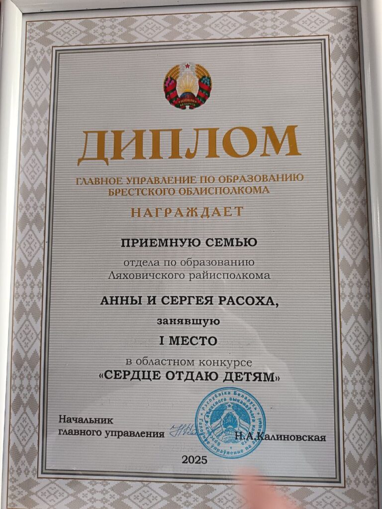 Приёмная семья Сергея и Анны Расоха награждена дипломом I степени главного управления по образованию Брестского облисполкома!