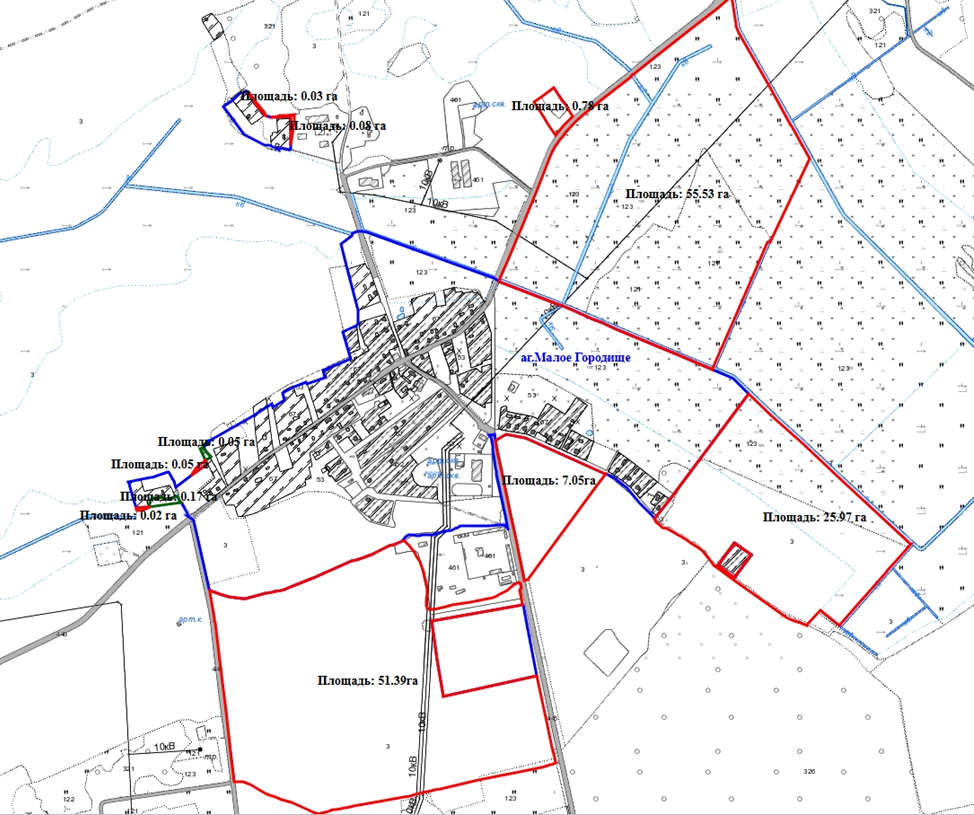 1.3. агрогородка Малое Городище Ольховского сельсовета, исключив из его черты земельные участки общей площадью 142,35 га и включив в его черту земельные участки общей площадью 0,22 га, согласно приложению 3;