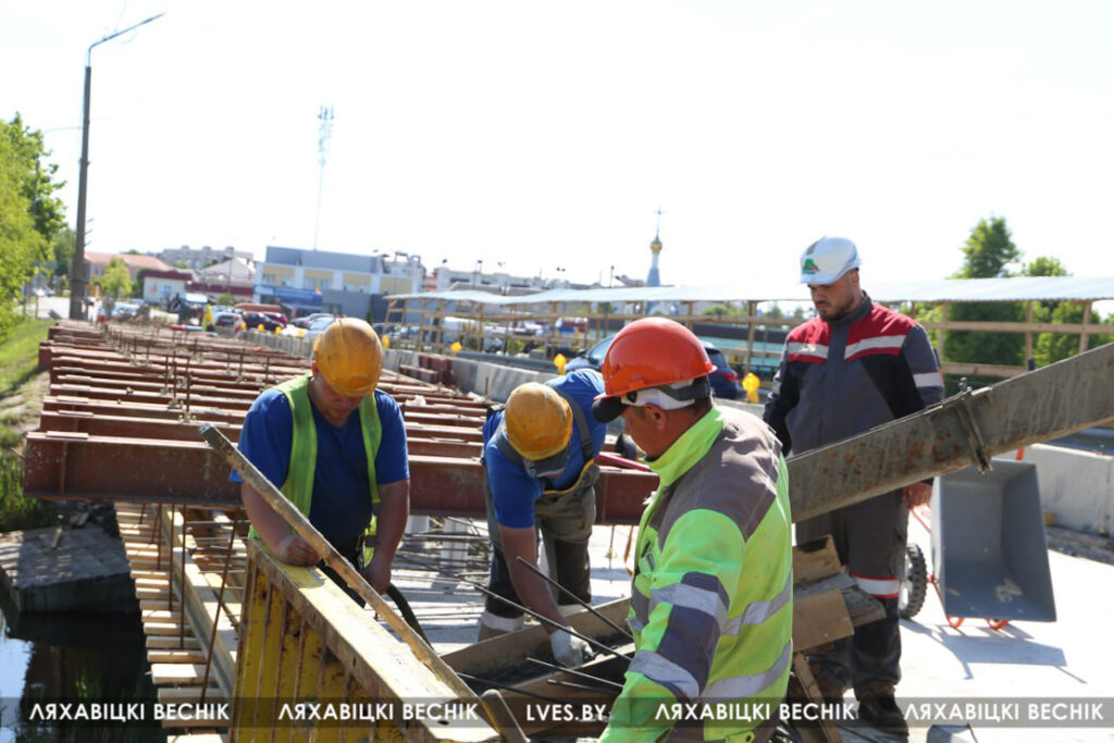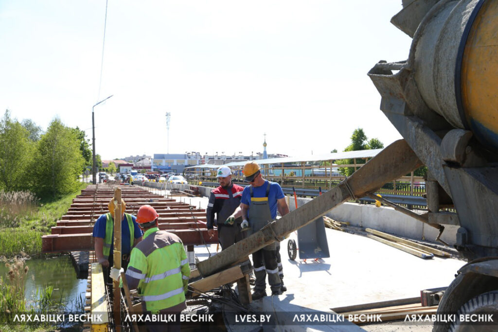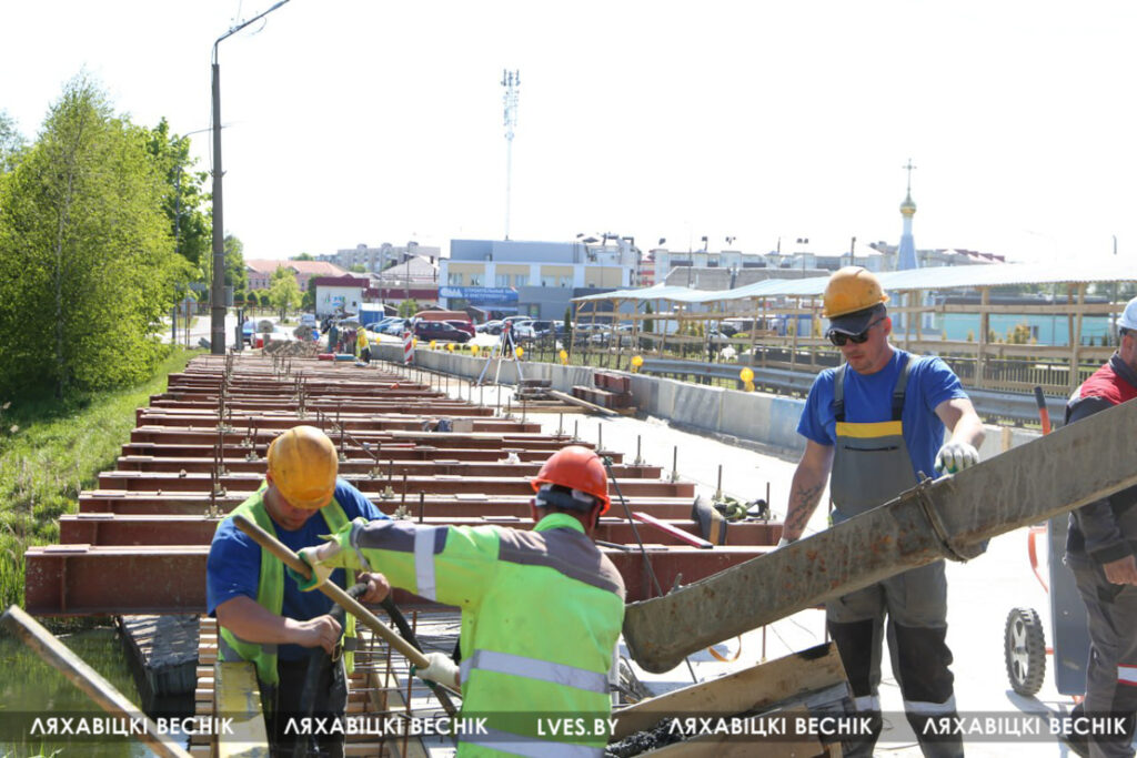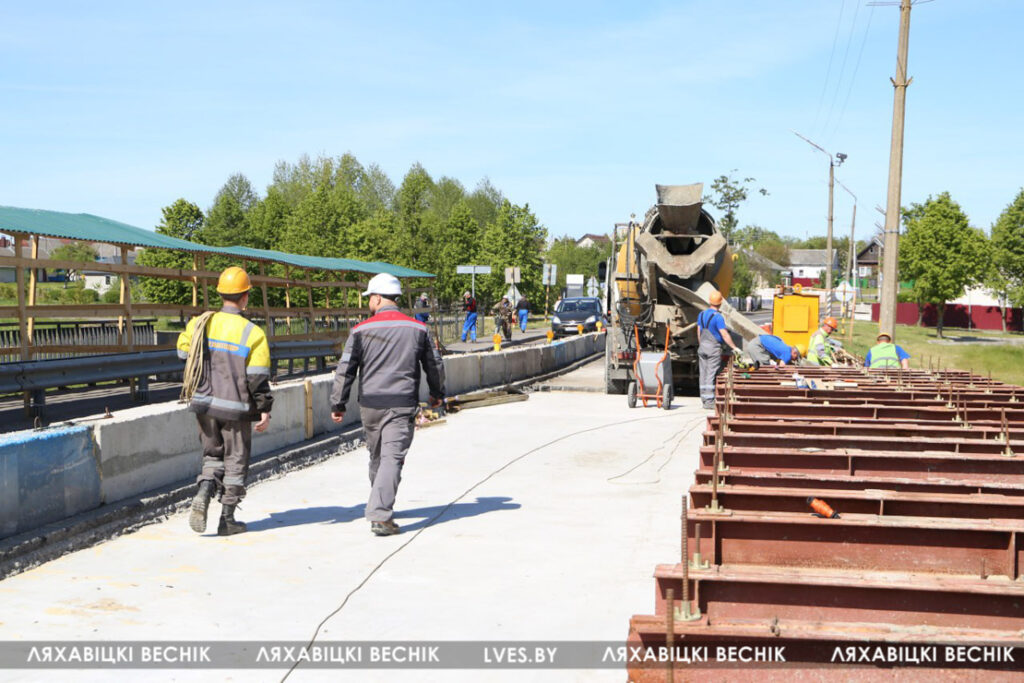 – Рамонт моста ідзе згодна графіка. На сённяшні дзень на адной з дарожных палос выкананы ўвесь комплекс дэмантажных работ. Пад асфальтабетоннае пакрыццё на паласе руху ўжо ўкладзена маналітная пліта. Зараз ідзе ўладкаванне пешаходнай дарожкі. Для гэтага вымашчана аснаванне для ўкладкі маналітнага жалезабетону. Да сярэдзіны чэрвеня будаўнікі плануюць выкласці дарожку пліткай і ўстанавіць металічную агароджу, таксама закатаюць праезную частку асфальтабетоннай сумессю. Далей пачнецца рамонт другой часткі моста. Плануецца, што да верасня аб’ект будзе здадзены, – расказаў намеснік дырэктара КУМВП ЖКГ “Ляхавіцкае ЖКГ” Віталій Калупановіч.
