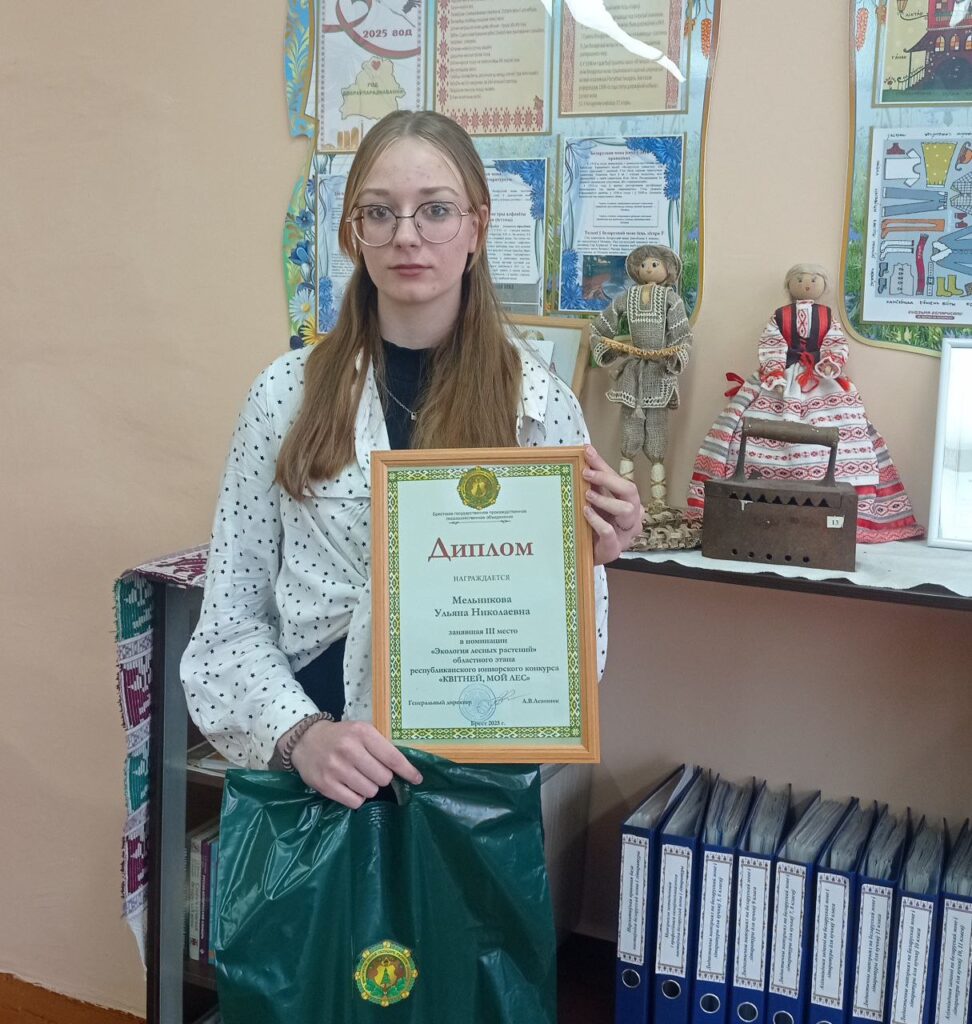 учащейся 9 класса ГУО «Кривошинская средняя школа» Ляховичского района Ульяне Мельниковой, занявшей 3 место в номинации «Экология лесных растений» за проект «Распространение омелы белой на территории Кривошинского лесничества Ляховичского лесхоза» (руководитель проекта Филиппович Н.М.)