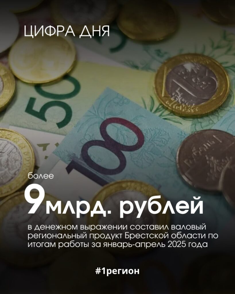 ЦИФРА ДНЯ: Более 9 млрд. рублей в денежном выражении составил валовый региональный продукт Брестской области по итогам работы за январь-апрель 2025 года
