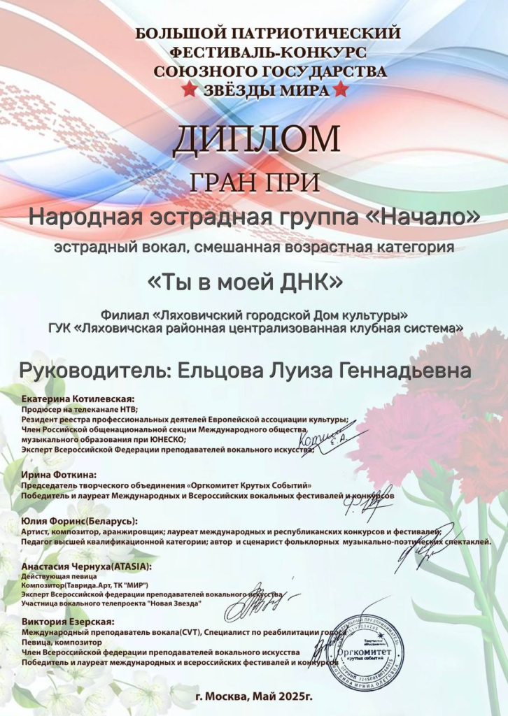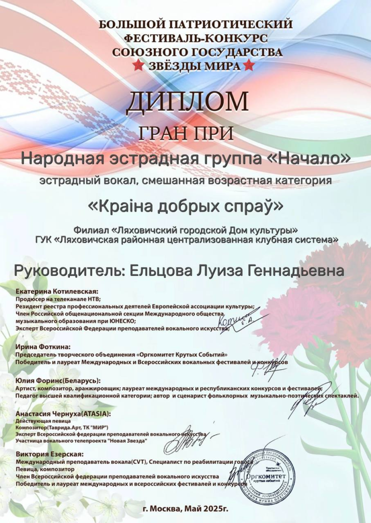 Народная эстрадная группа «Начало» филиала «Ляховичский ГДК» приняла участие в Большом патриотическом фестивале-конкурсе Союзного государства «Звезды мира» (г.Москва). Результат — ГРАН-ПРИ за два конкурсных номера.